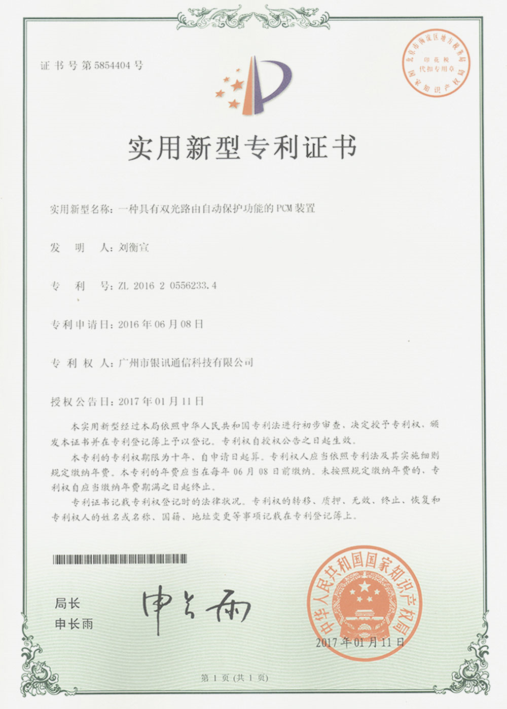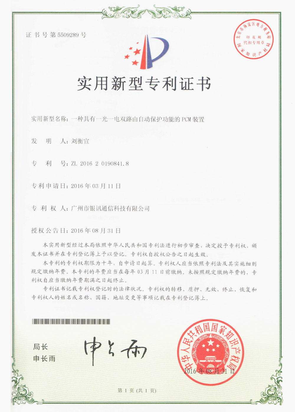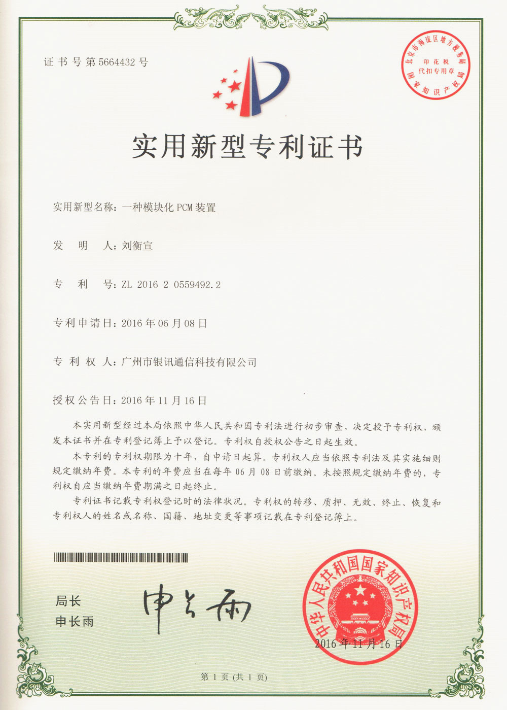 國(guó)家專利證書