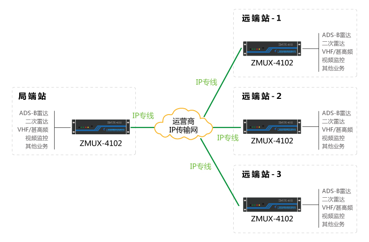 基于IP專線、光纖線路、E1 線路自動(dòng)切換:遠(yuǎn)端站到局端之間,租用運(yùn)營(yíng)商IP專線與E1線路、光纖線路,通過接入ZMUX-4102平臺(tái),完成IP專線與E1線、光纖線路自動(dòng)切換功能,保障甚高頻、雷達(dá)數(shù)據(jù)等業(yè)務(wù)的安全可靠性傳輸。